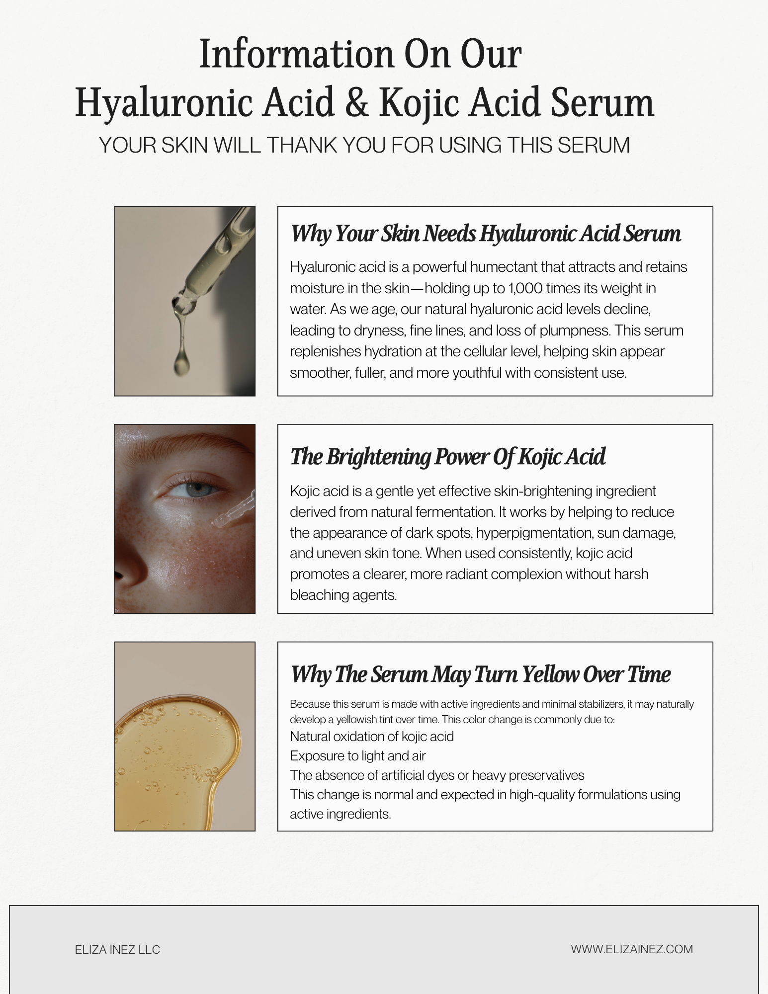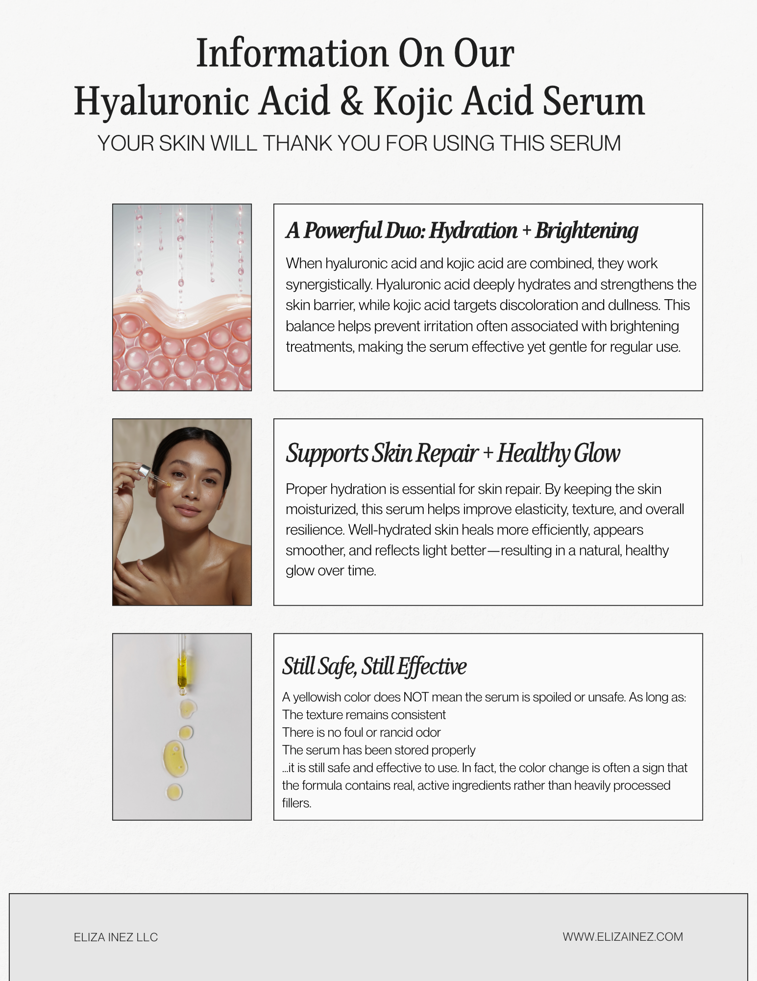 This Hyaluronic Acid Kojic acid Facial Serum is made with scientifically proven ingredients. With the added benefits of hyaluronic acid and kojic acid, this serum will deeply hydrate your skin and reduce the appearance of dark spots, leaving you with a brighter and more youthful complexion.
